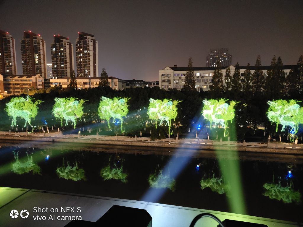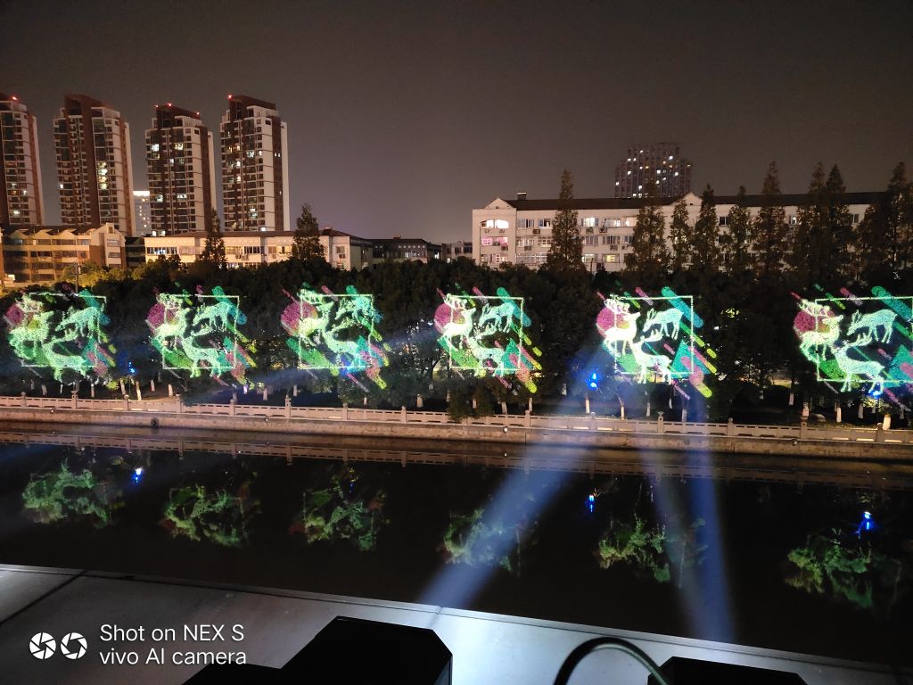 江蘇昆山婁江碼頭樹(shù)木投影,項(xiàng)目位于江蘇省昆山市金鷹廣場(chǎng)對(duì)面,使用12臺(tái)1000W(LED圖案燈),型號(hào):LightWin-PGF5000(玻璃圖案版),投影距離80米,投影河對(duì)面樹(shù)木,在樹(shù)木上投影鹿的圖案。