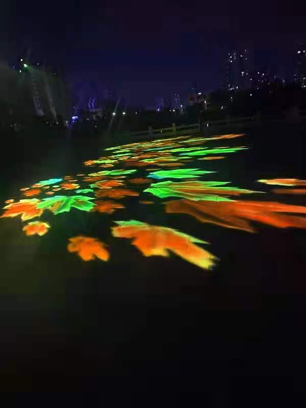 中山市康樂大道亮化提升地面投影,使用4臺(tái)LED圖案燈(800W),16臺(tái)LED圖案燈(500W),型號(hào):LightWin-800WSPOT/LightWin-500WSPOT,控制方式:DMX512。投影圖案,羽毛,楓葉,蝴蝶,星空等。